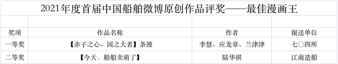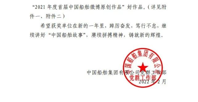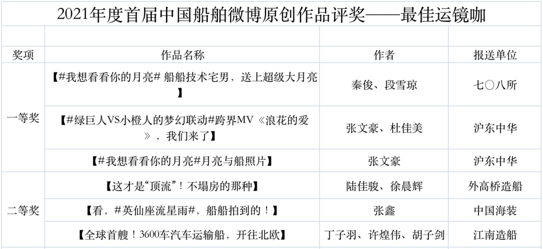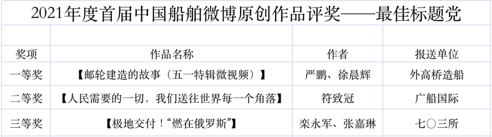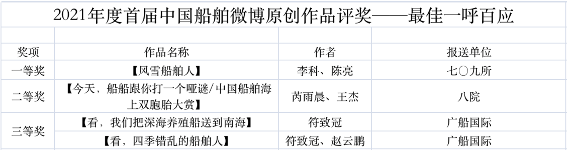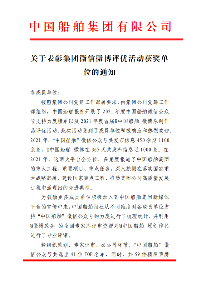 為鼓勵(lì)更多成員單位積極加入到中國(guó)船舶集團(tuán)新媒體平臺(tái)的宣傳中來(lái),在集團(tuán)公司黨群工作部的指導(dǎo)下,中國(guó)船舶報(bào)社從不同維度,對(duì)2021年度各單位支持“中國(guó)船舶”微信的力度進(jìn)行了梳理統(tǒng)計(jì),并利用微博政務(wù)的全國(guó)專家?guī)煸u(píng)審資源,對(duì)2021年度“中國(guó)船舶”微博原創(chuàng)作品進(jìn)行了專業(yè)評(píng)審,評(píng)選結(jié)果公布如下: