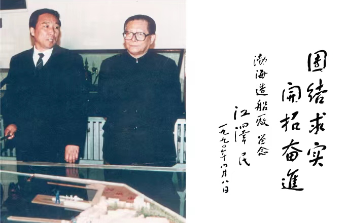 1990 年4月8日,江澤民同志視察渤海造船廠并題詞“團結求實,開拓奮進”。