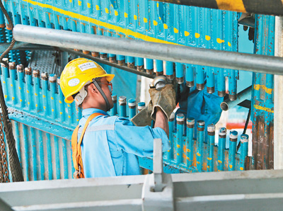 一名中國(guó)施工人員正在進(jìn)行鍋爐受熱面打磨對(duì)口作業(yè)。本報(bào)記者 劉 剛攝