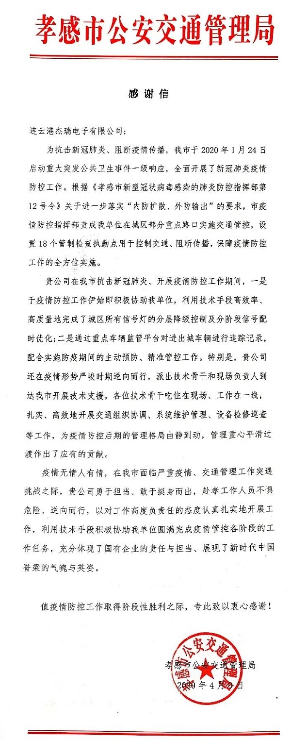 ????中國船舶集團七一六所下屬杰瑞電子公司收到湖北省孝感市公安交通管理局發來的感謝信,對杰瑞電子赴孝感工作人員不懼危險、逆向而行,以高度負責任的態度,利用技術手段,積極協助疫情防控工作表示感謝。