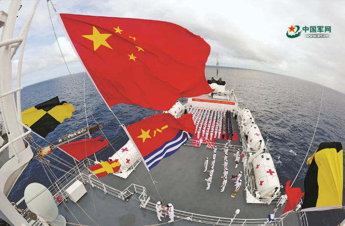 “和平方舟”號醫(yī)院船在大洋上舉行隆重升旗儀式。來源:中國軍網 江 山攝