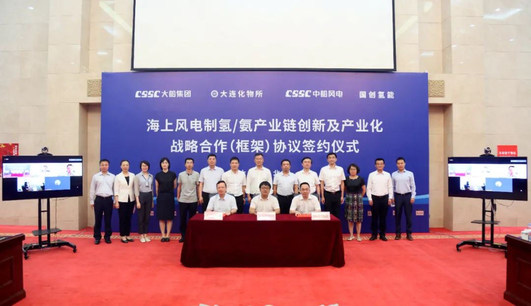 8月6日,中國船舶集團旗下大船集團舉行《海上風(fēng)電制氫/氨產(chǎn)業(yè)鏈創(chuàng)新及產(chǎn)業(yè)化戰(zhàn)略合作(框架)協(xié)議》簽約儀式。大船集團與大連化物所、國創(chuàng)氫能、中船風(fēng)電四方代表在協(xié)議書上簽字。