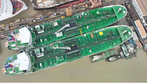 中國船舶集團旗下廣船國際建造的國內首型甲醇雙燃料動力船2艘姊妹船肩并肩!