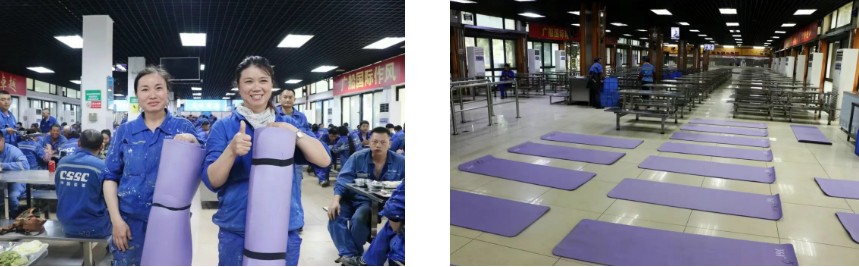 中午時分,走進廣船國際生產(chǎn)指揮樓食堂,十幾臺空調(diào)已經(jīng)提前開啟,食堂內(nèi)涼爽舒適。據(jù)介紹,該公司已經(jīng)將會議室、食堂等公共區(qū)域開放給一線員工作為午間的“休憩港灣”,讓一線員工得以安心小憩、恢復(fù)體力。13個食堂內(nèi),除了不銹鋼凳子、桌子可以供員工躺下休息之外,還為員工準(zhǔn)備了瑜伽墊。